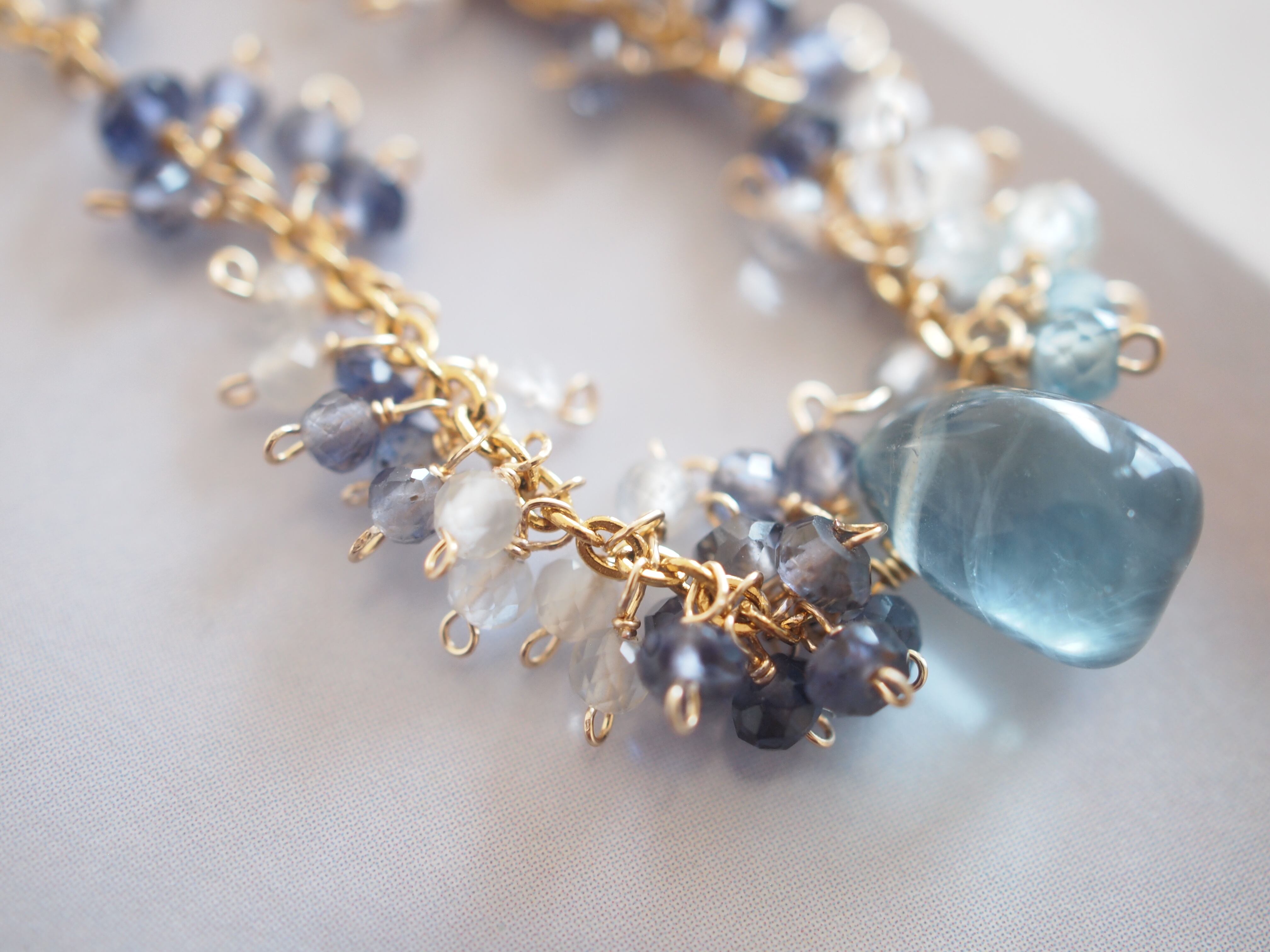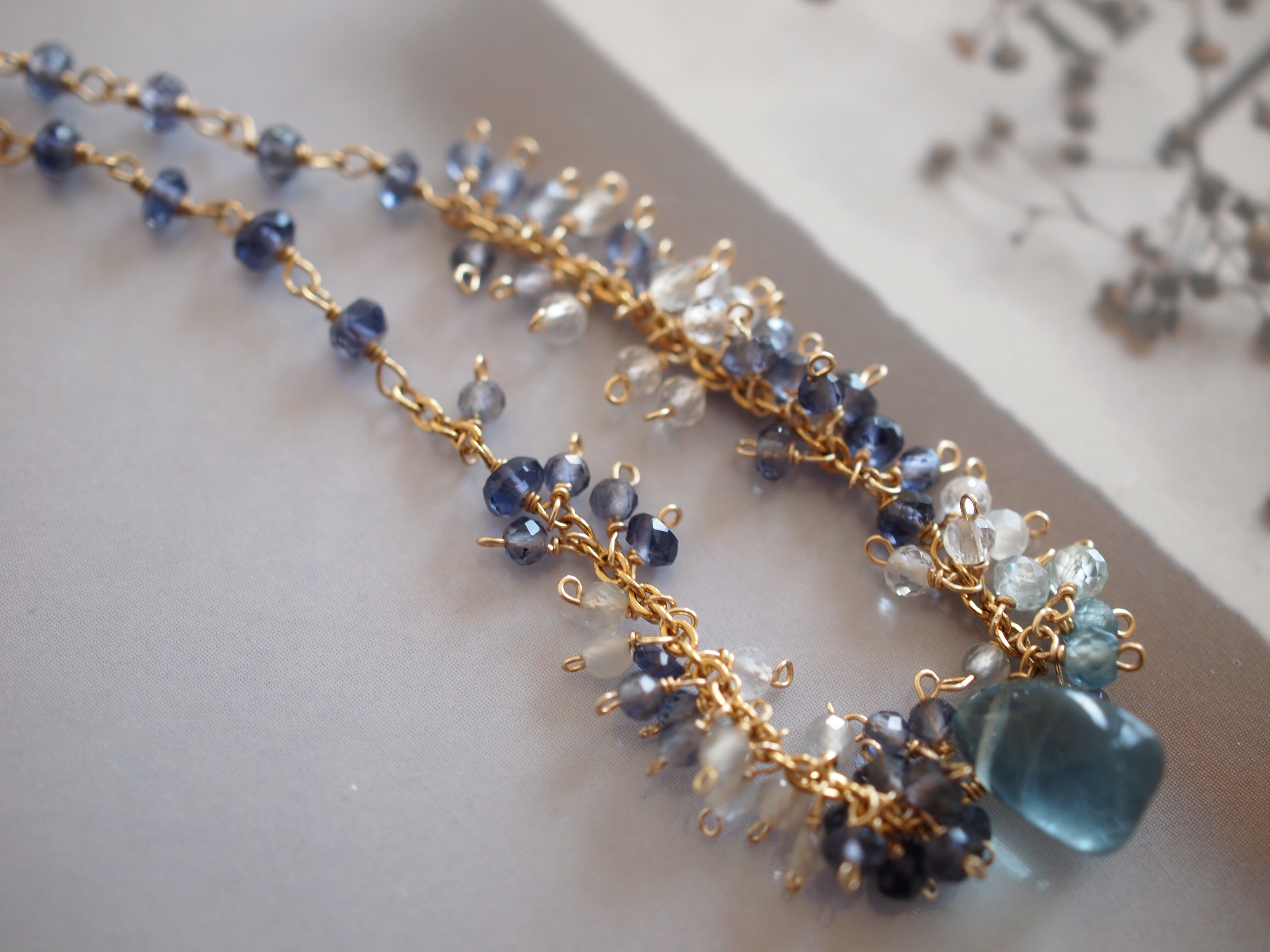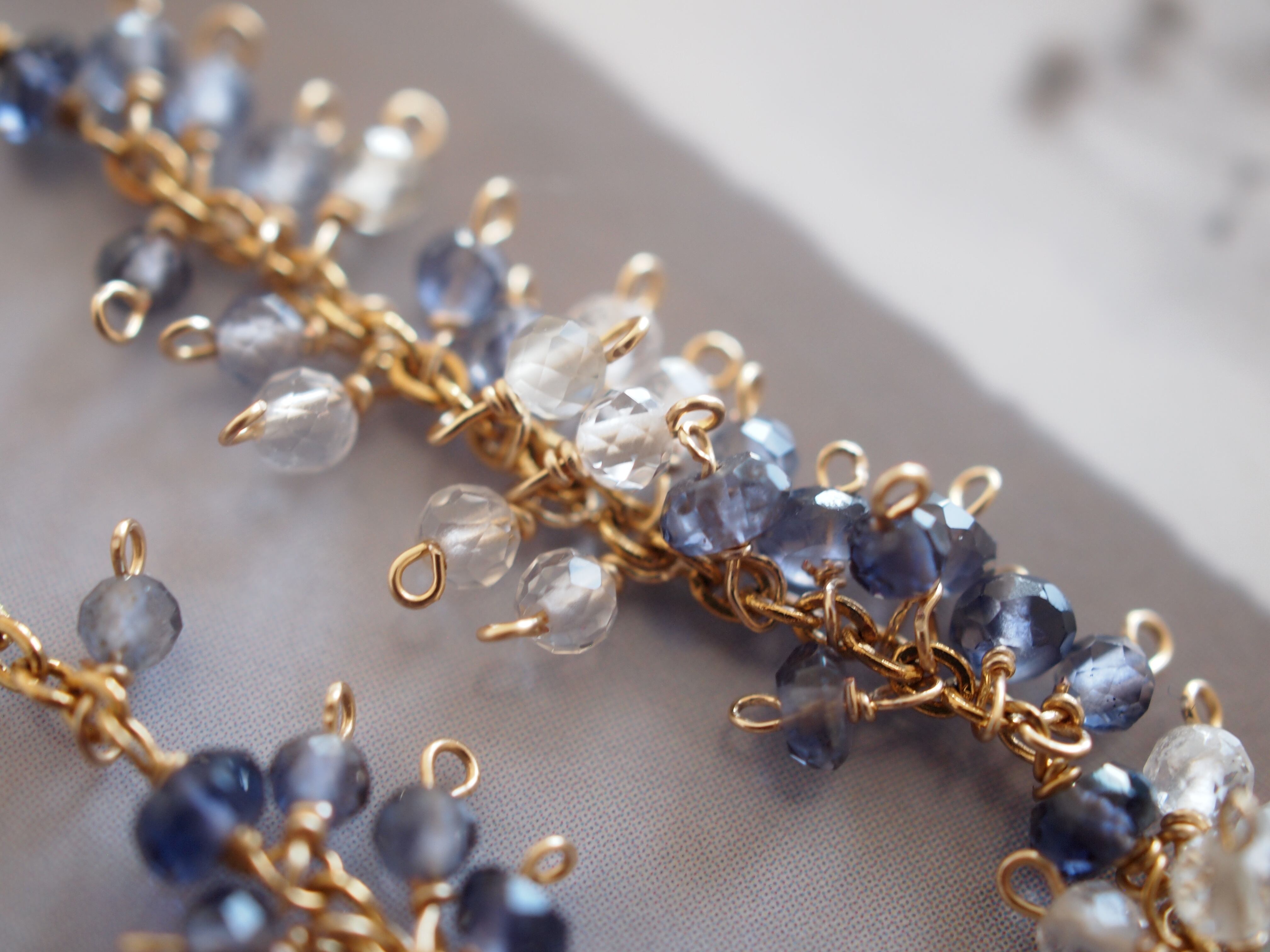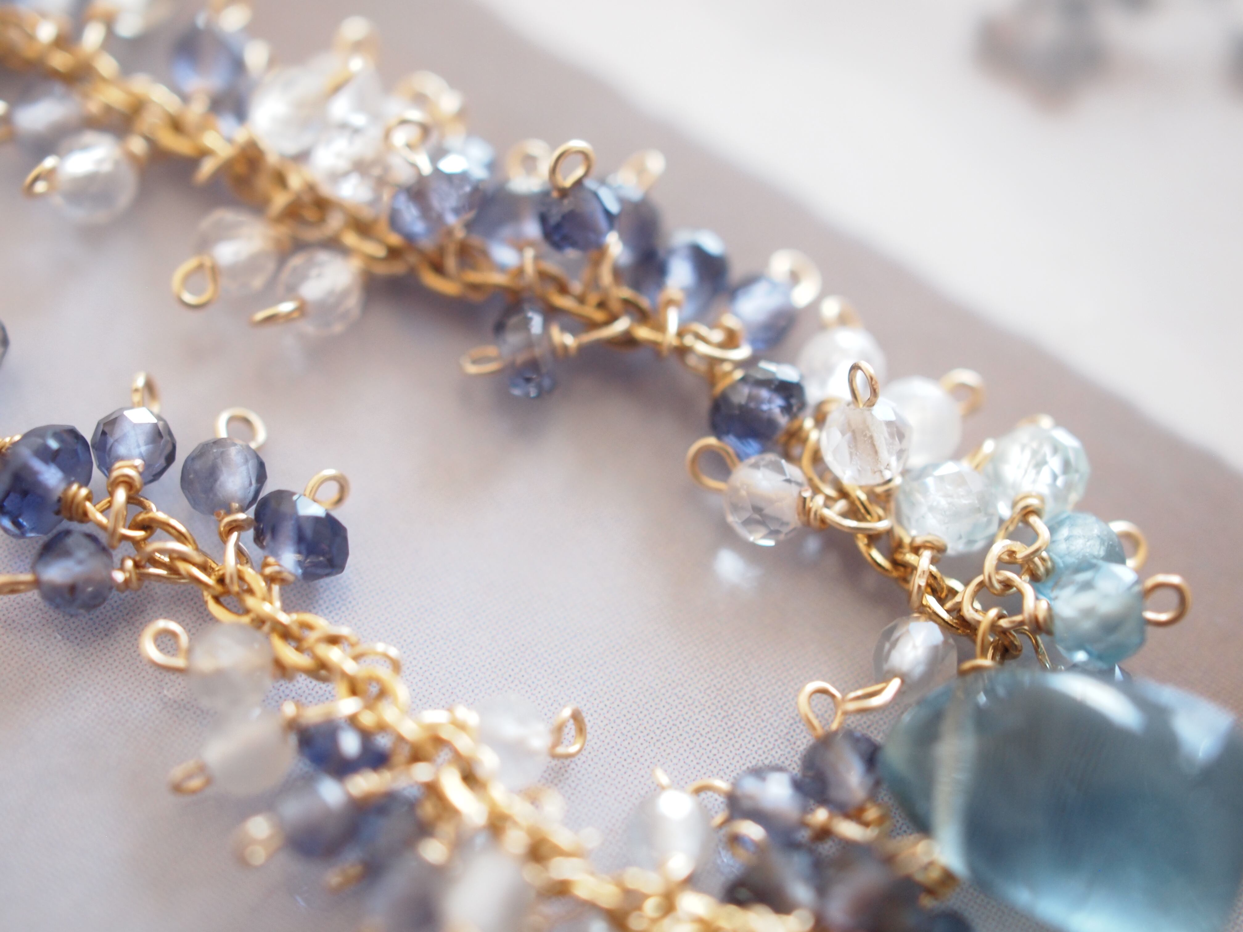 小粒のアイオライトやグレームーンストーン、クリスタルが軽やかに揺れ、