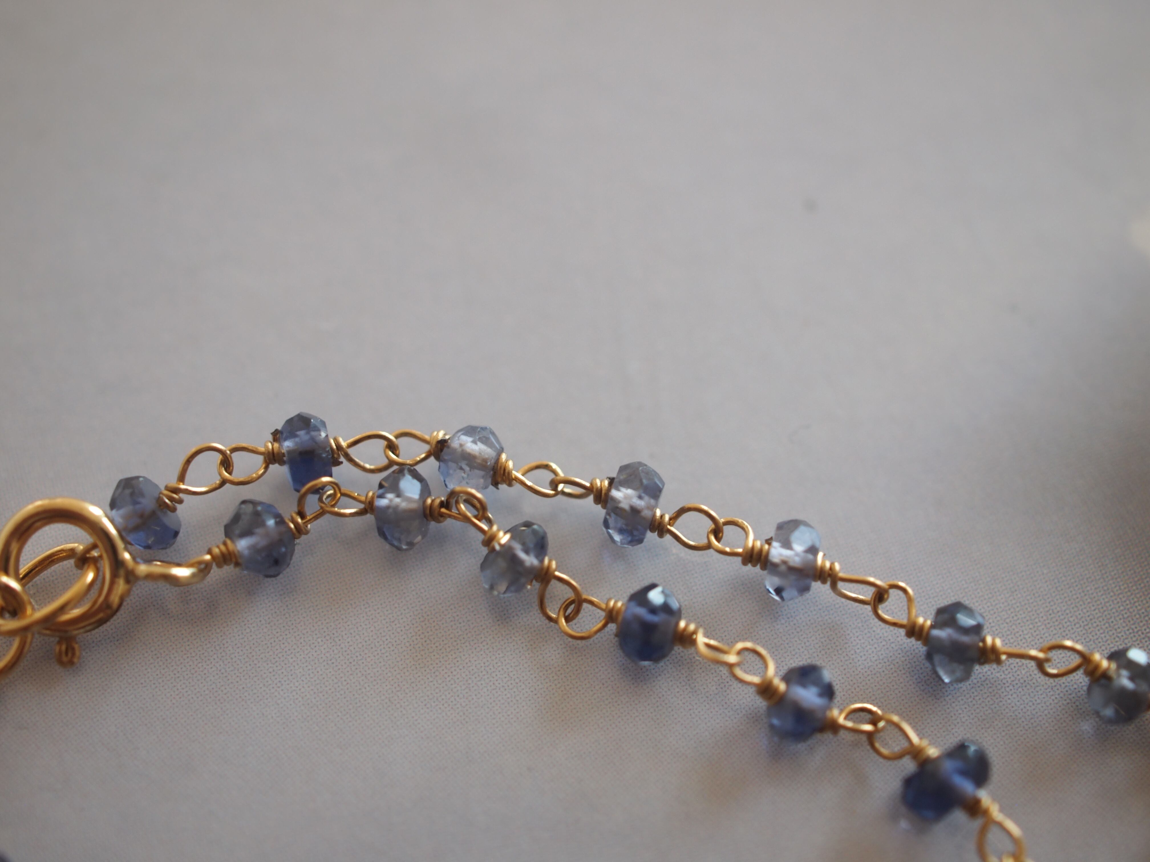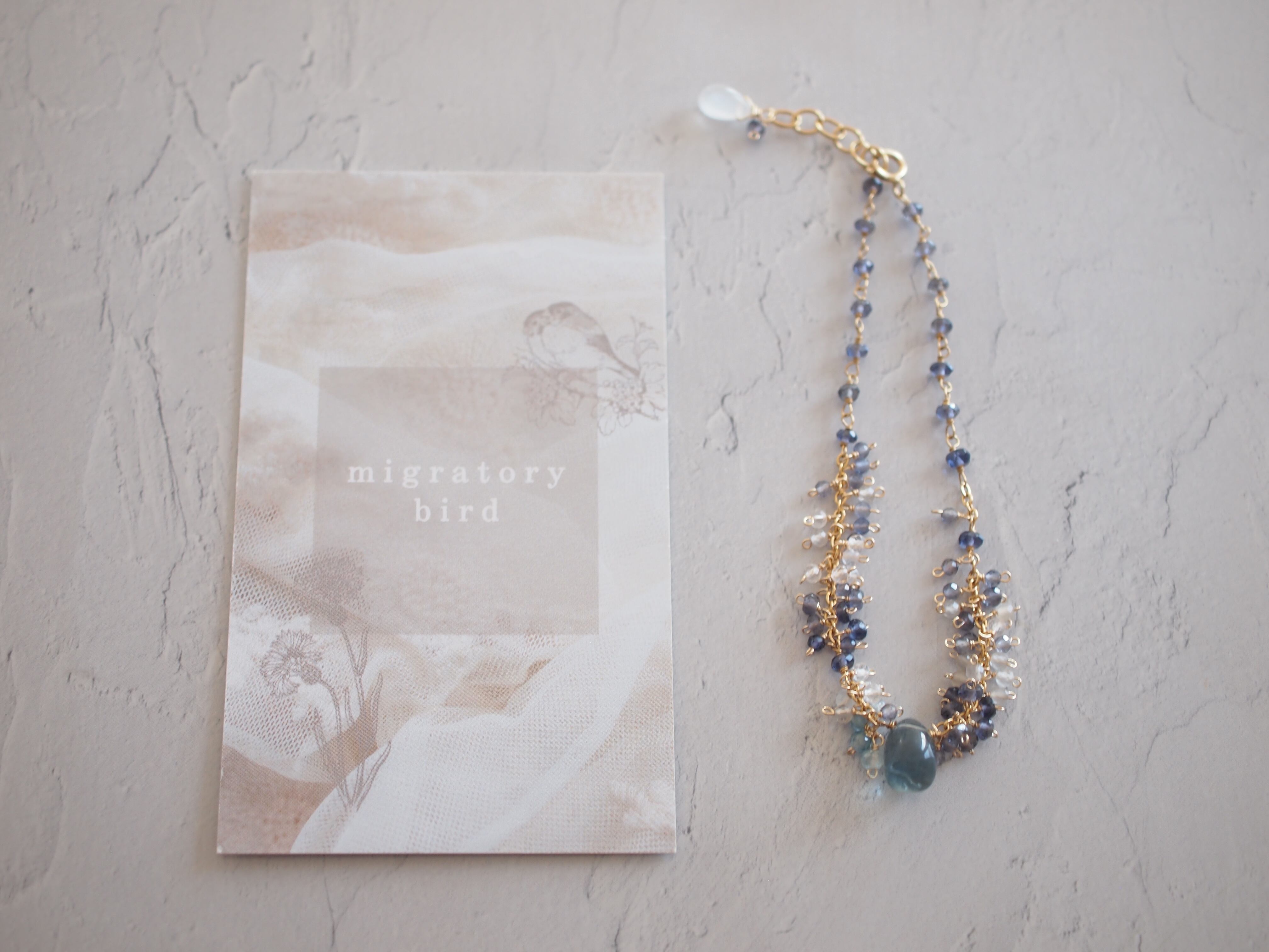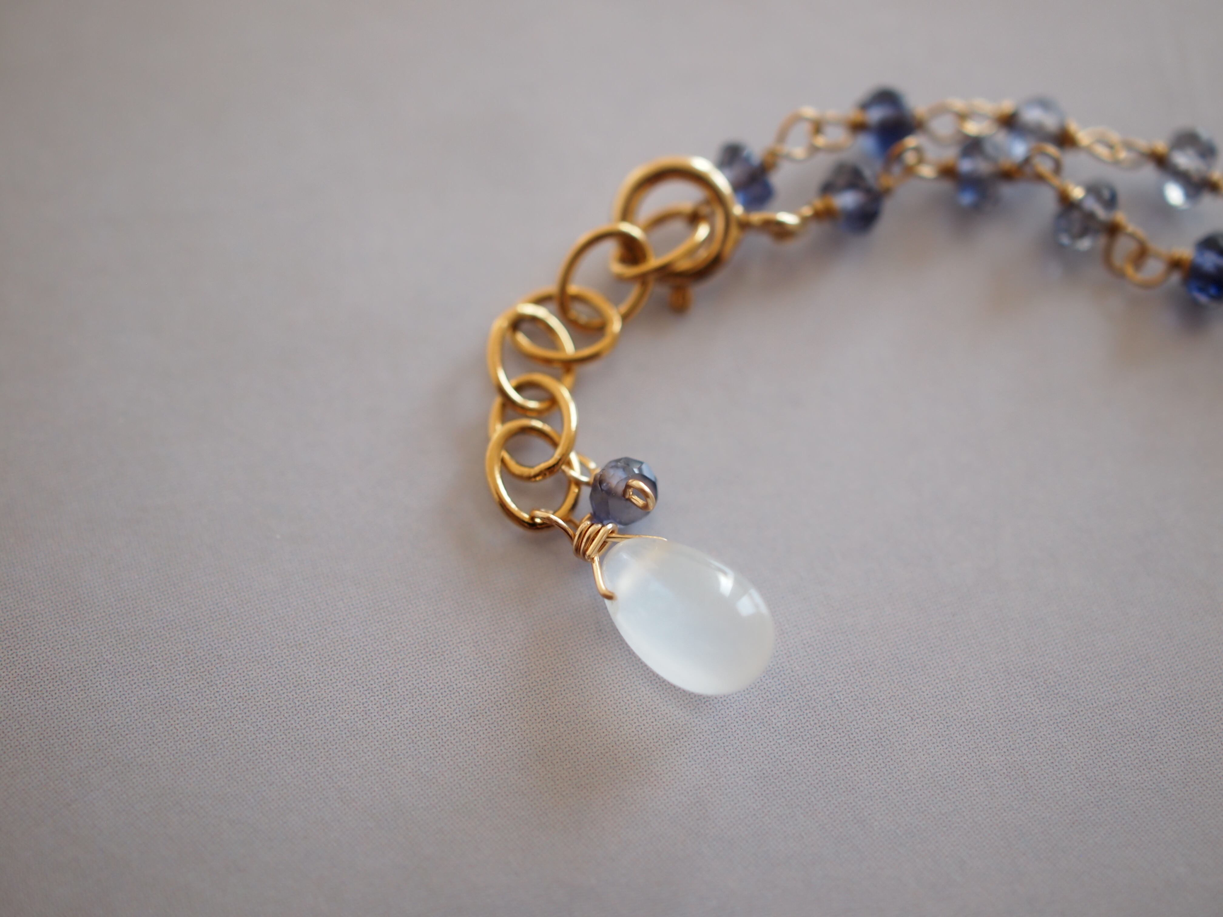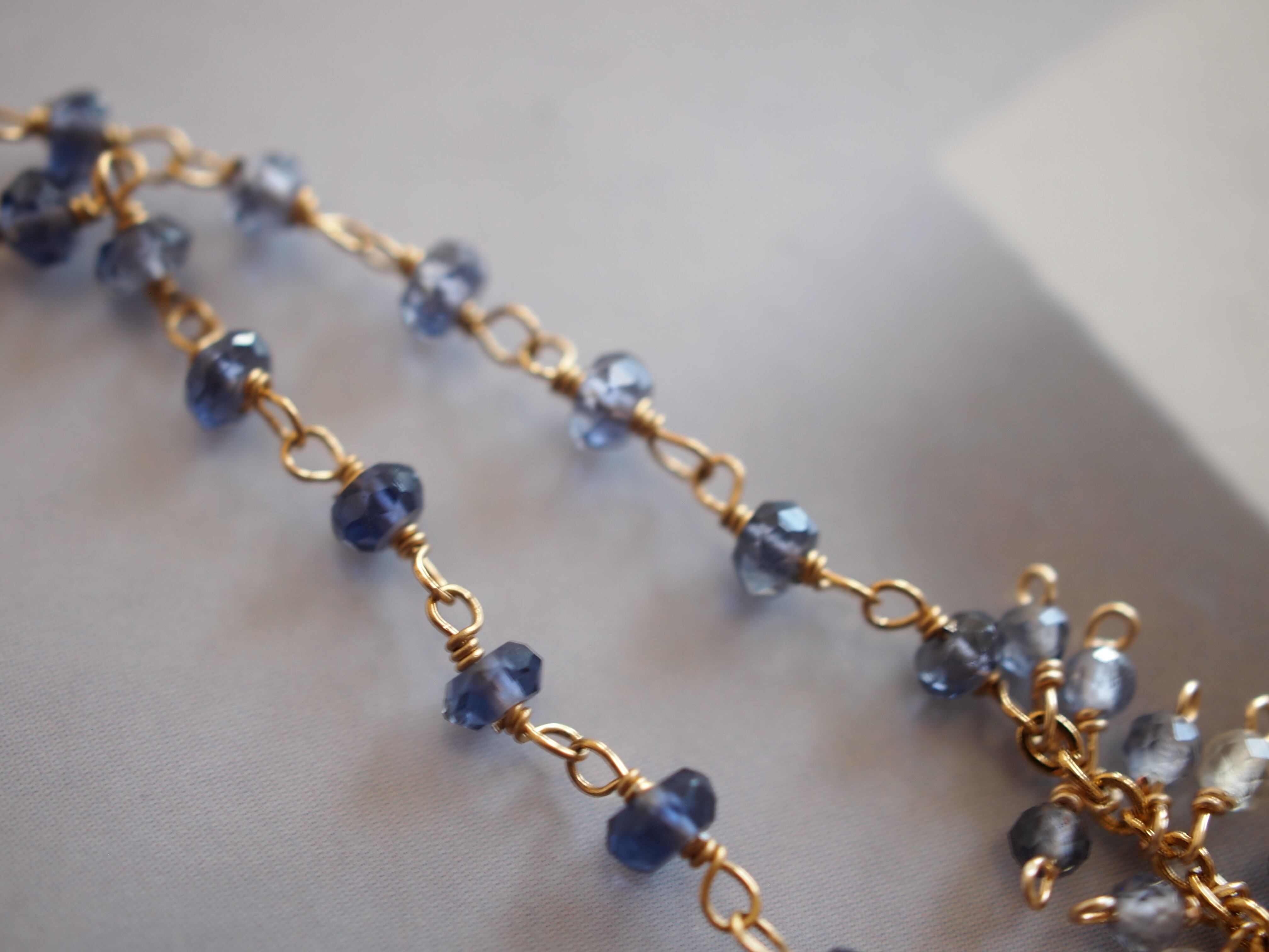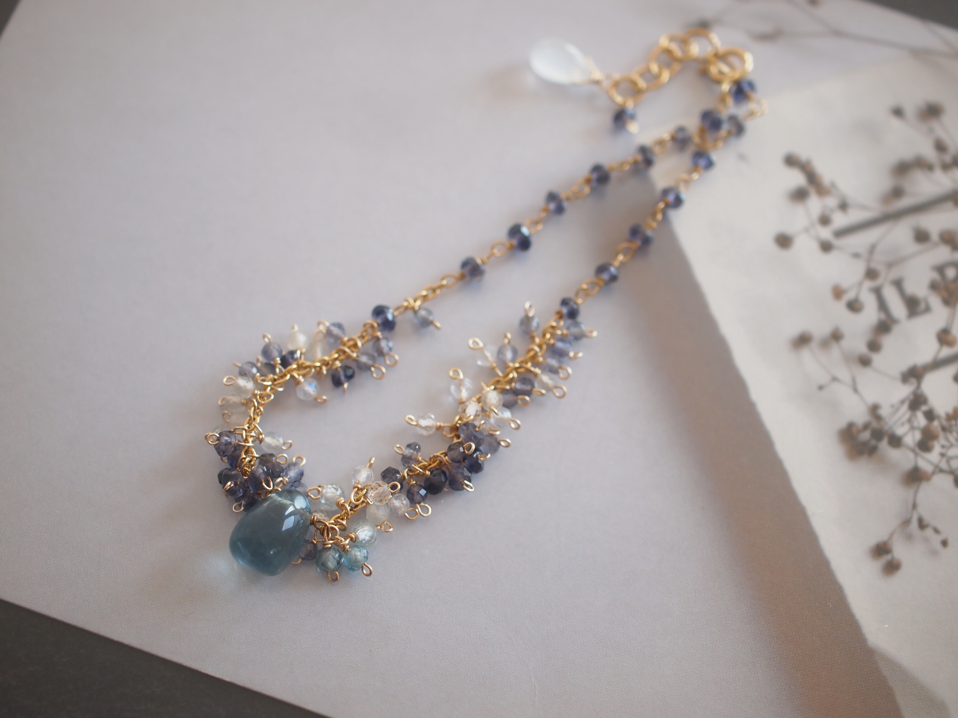小粒のアイオライトやグレームーンストーン、クリスタルが軽やかに揺れ、