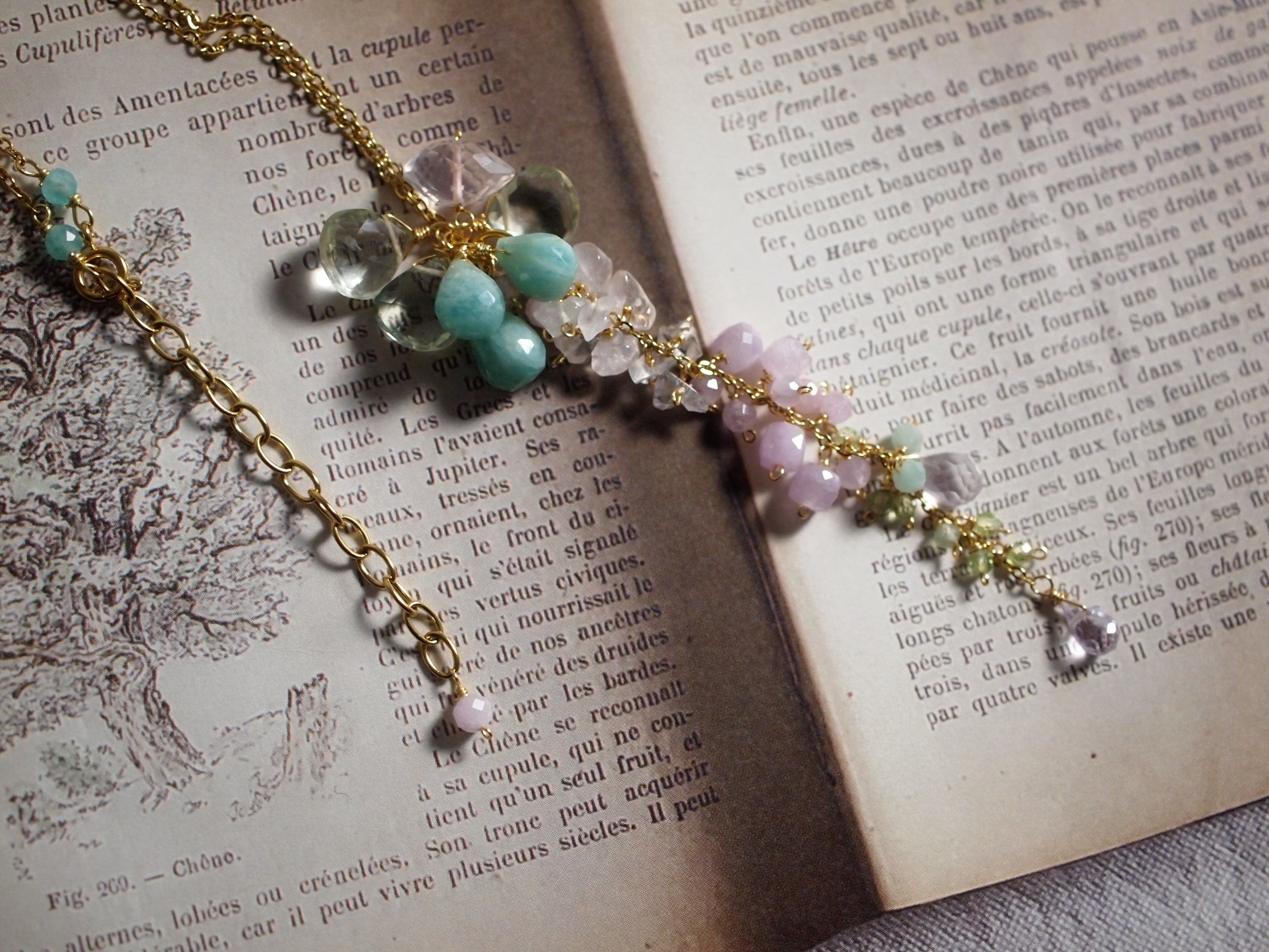そこに、小粒のクンツァイトやペリドット、アマゾナイトを重ね、