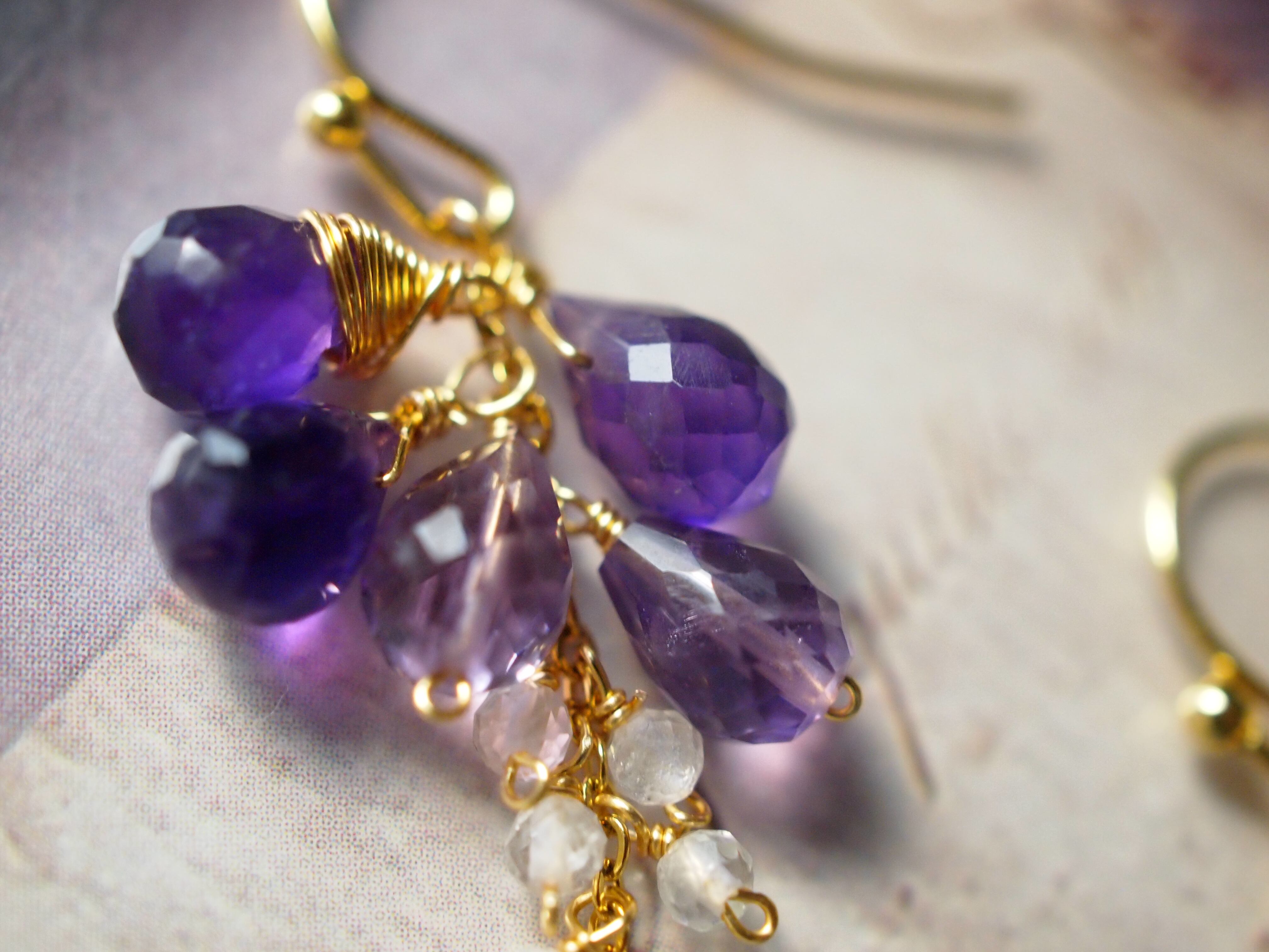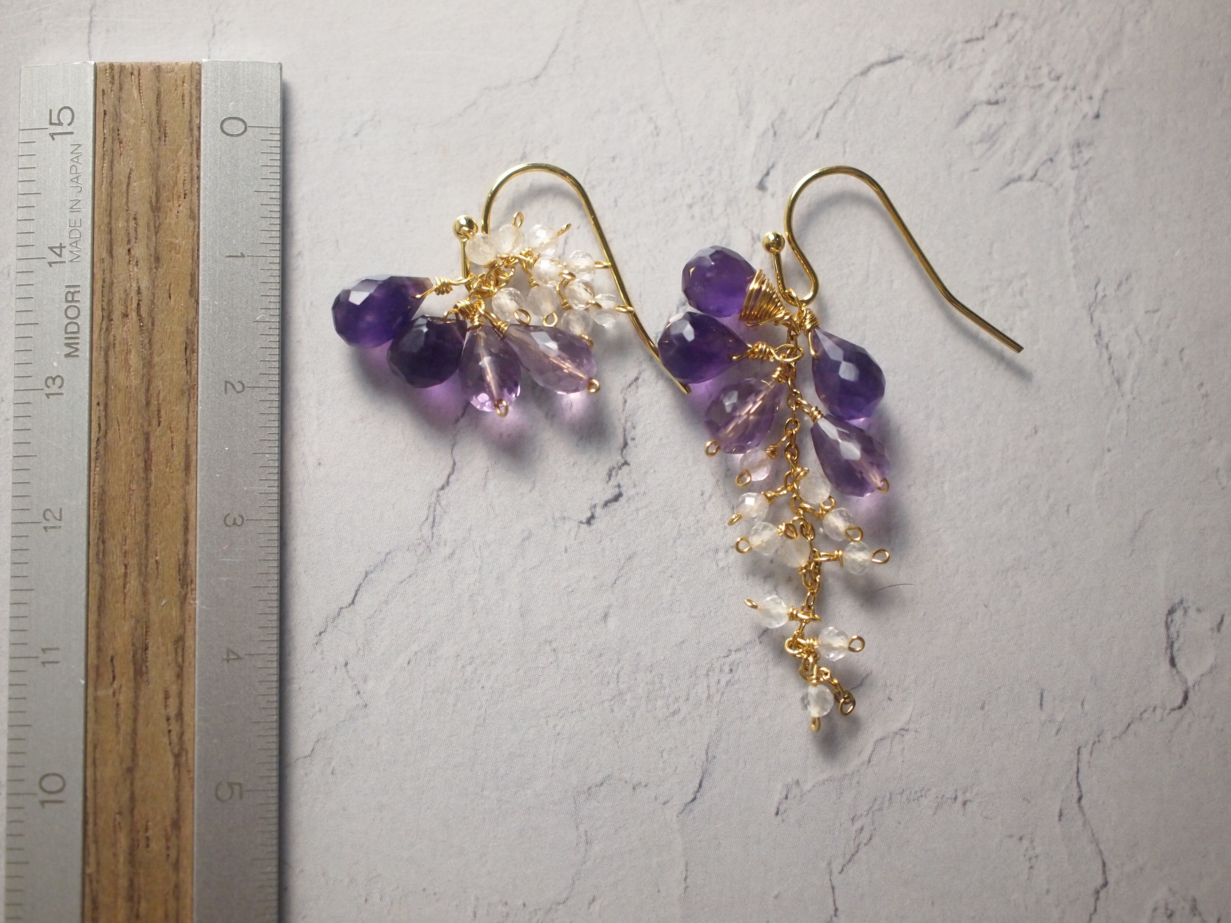 揺れるたび異なる紫の表情とクリスタルのきらめきが耳元でそっと重なります。