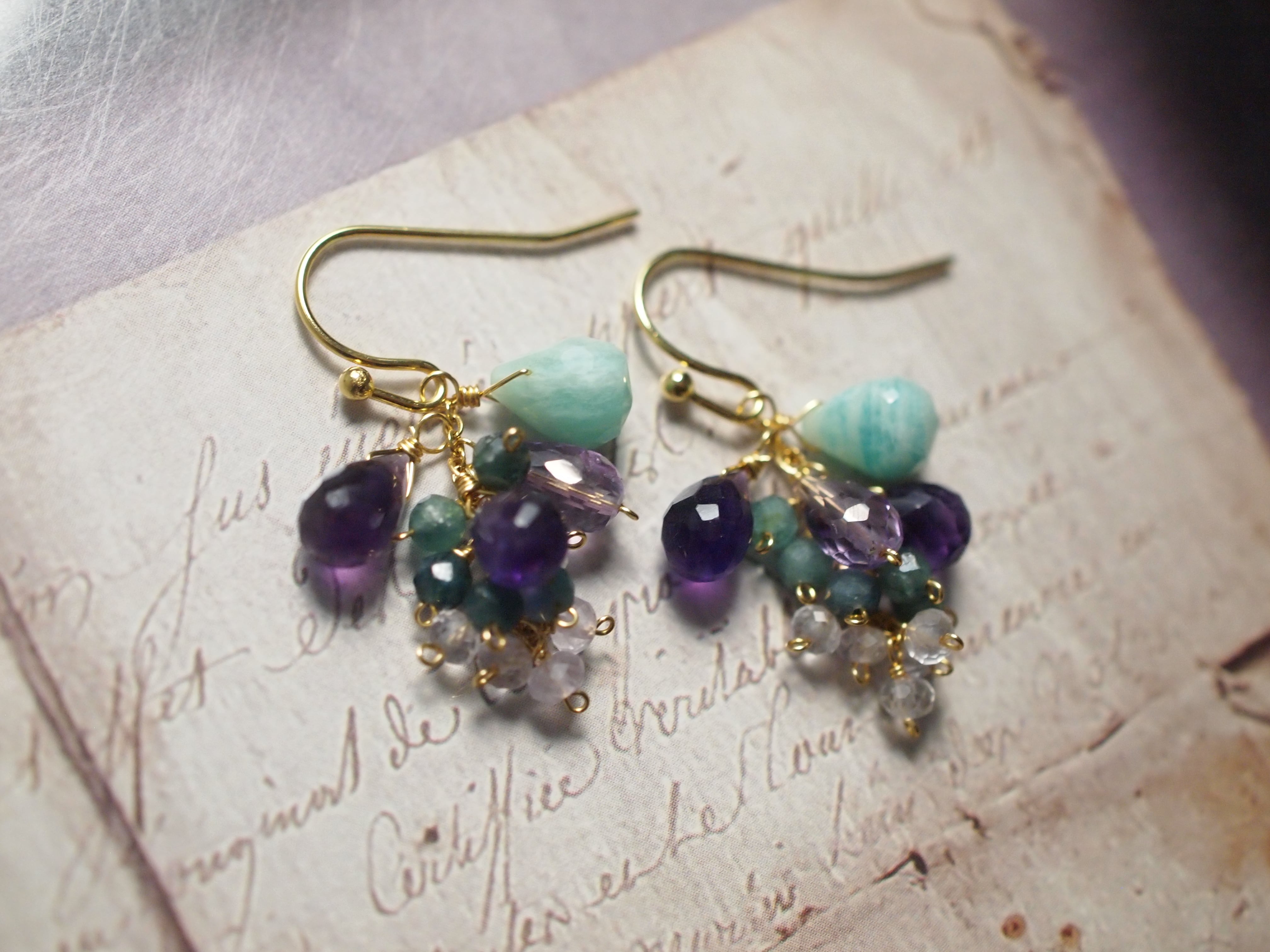 深い紫のアメジスト、やわらかなピンクアメジストを主役に、小粒のブルーグリーントルマリンと淡いピンクアメジストをあしらった、しゃらりと揺れるピアスです。