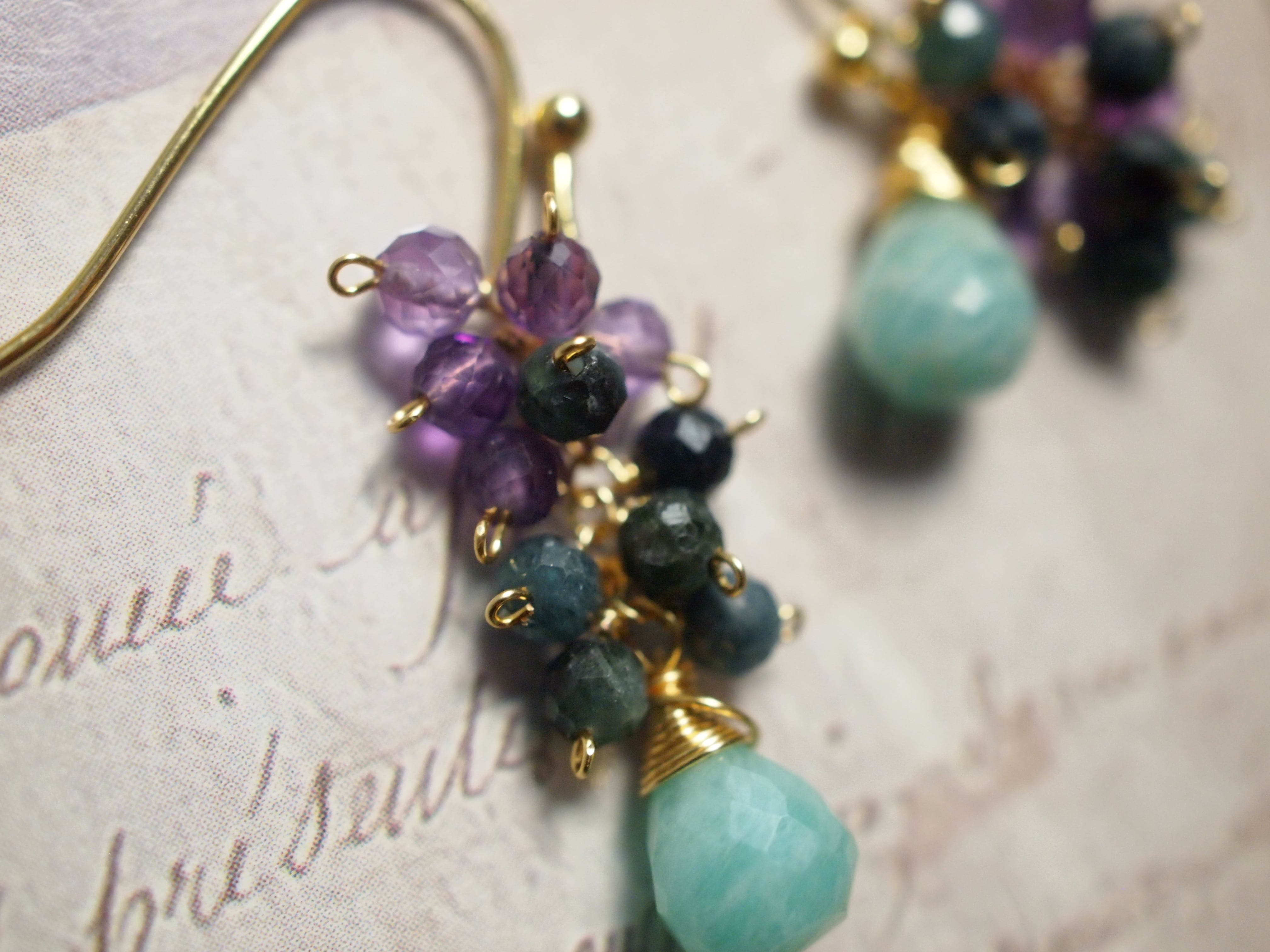 ドロップカットのアマゾナイトをメインに、小粒のブルーグリーントルマリンと深い紫のアメジストを組み合わせた、アシンメトリーデザインのピアスです。