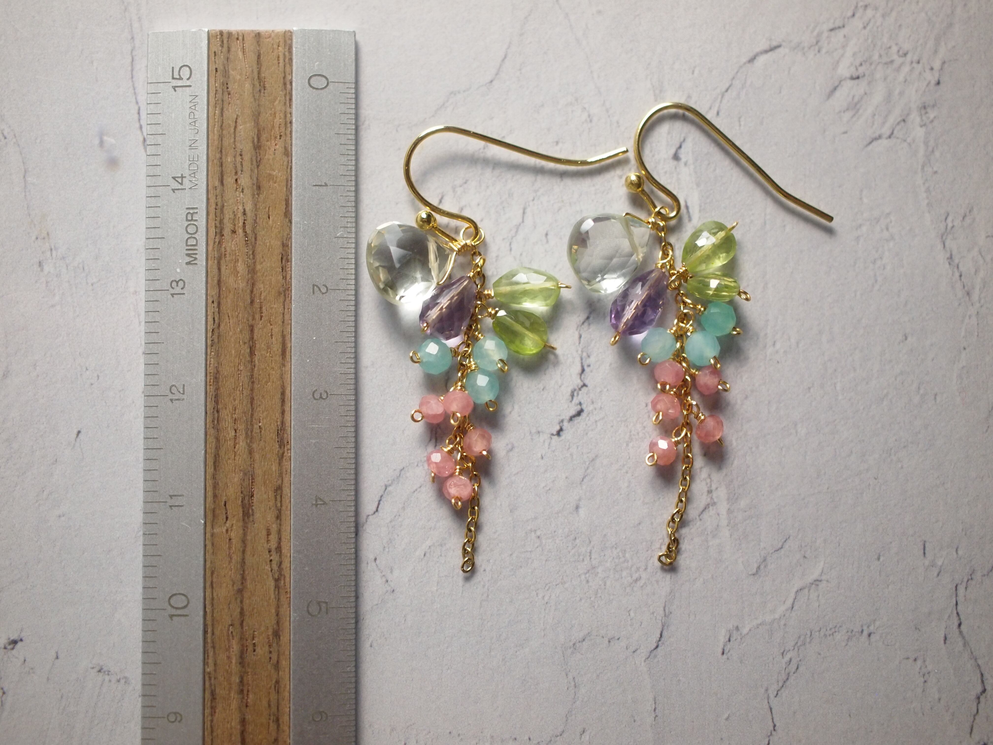 マロンカットのグリーンアメジストとドロップカットのピンクアメジストを中心に、