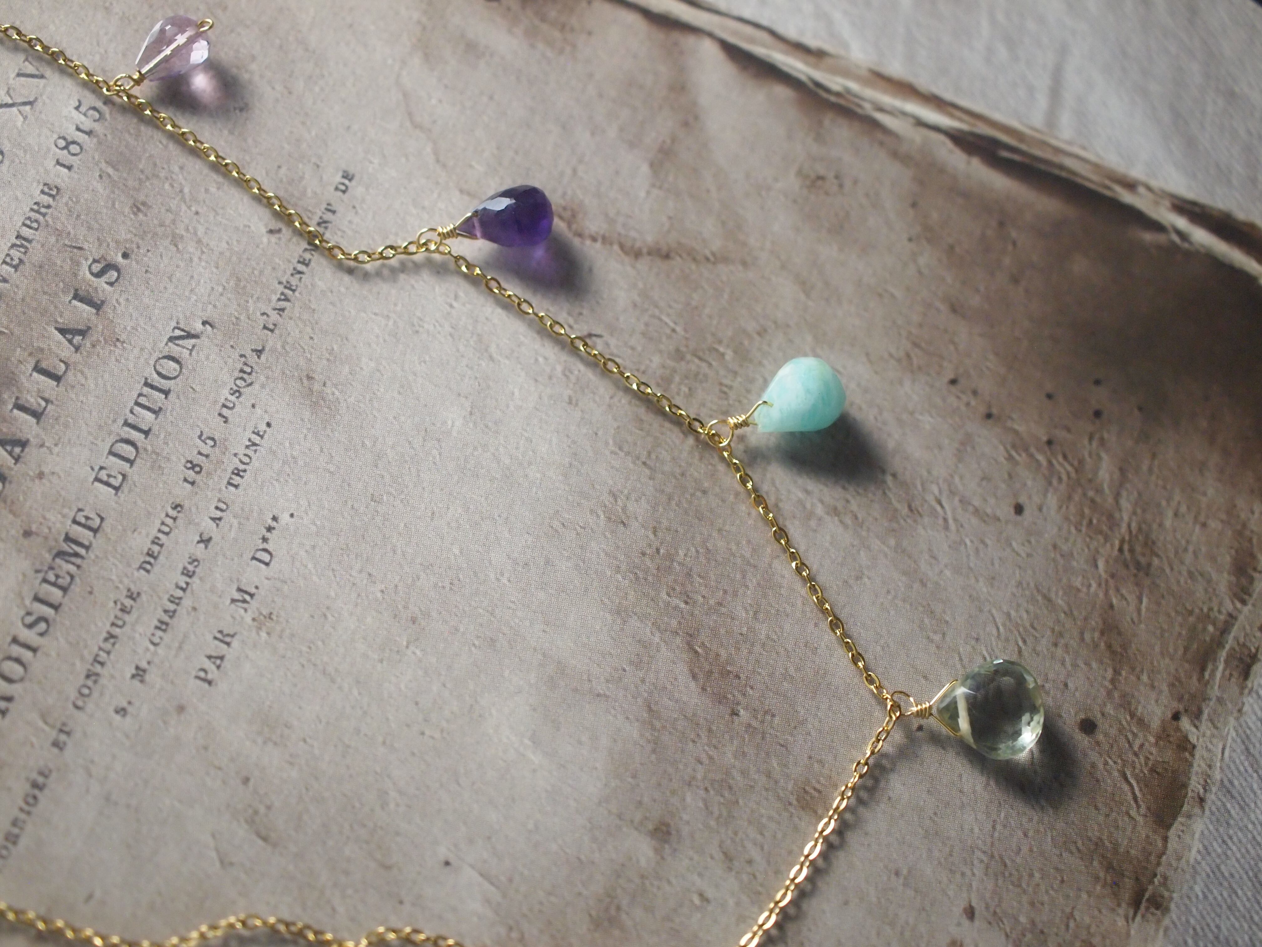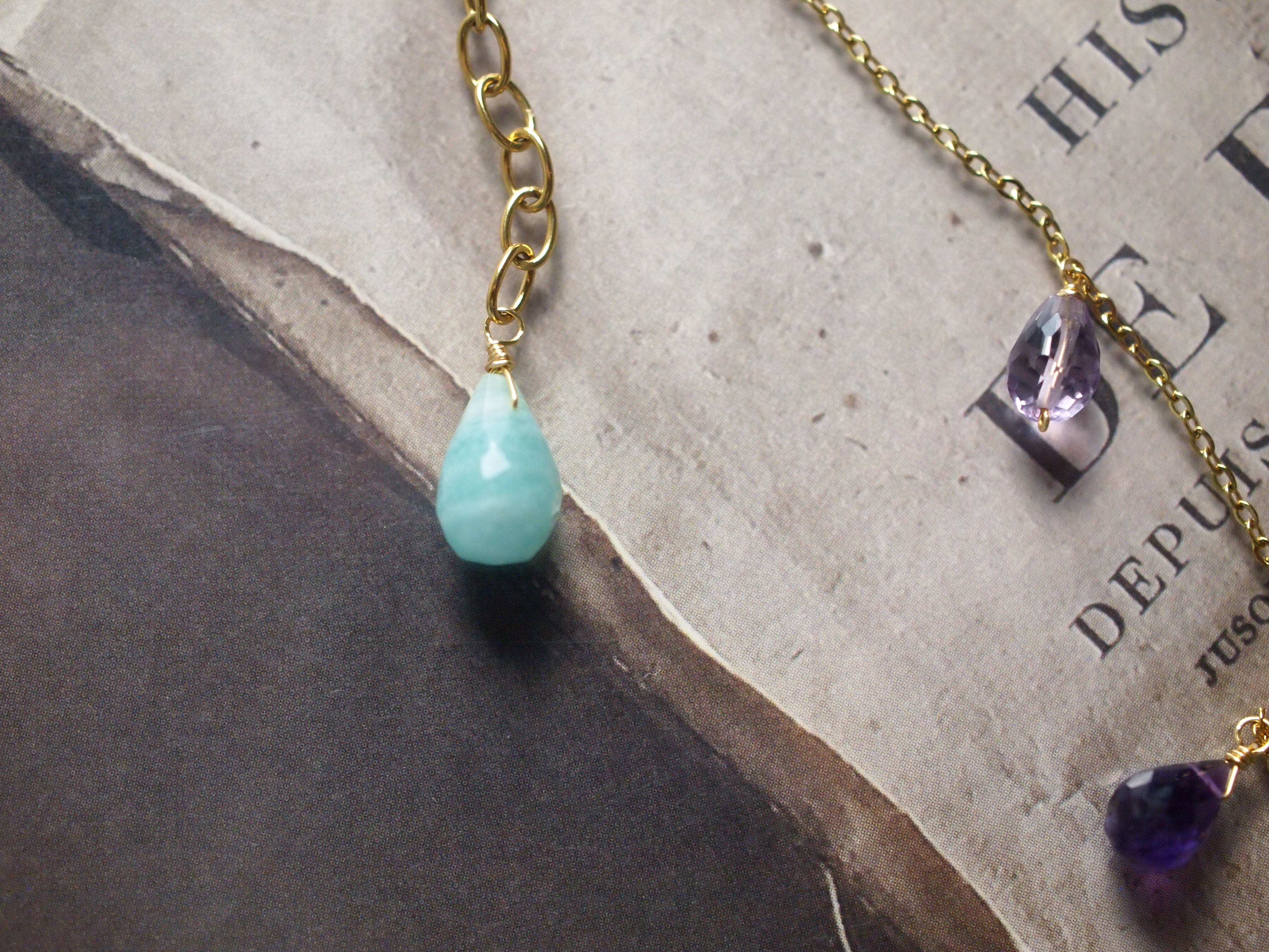 アマゾナイトが胸元で優雅に揺れ、それぞれの石が持つ個性豊かな色合いを楽しめます。
