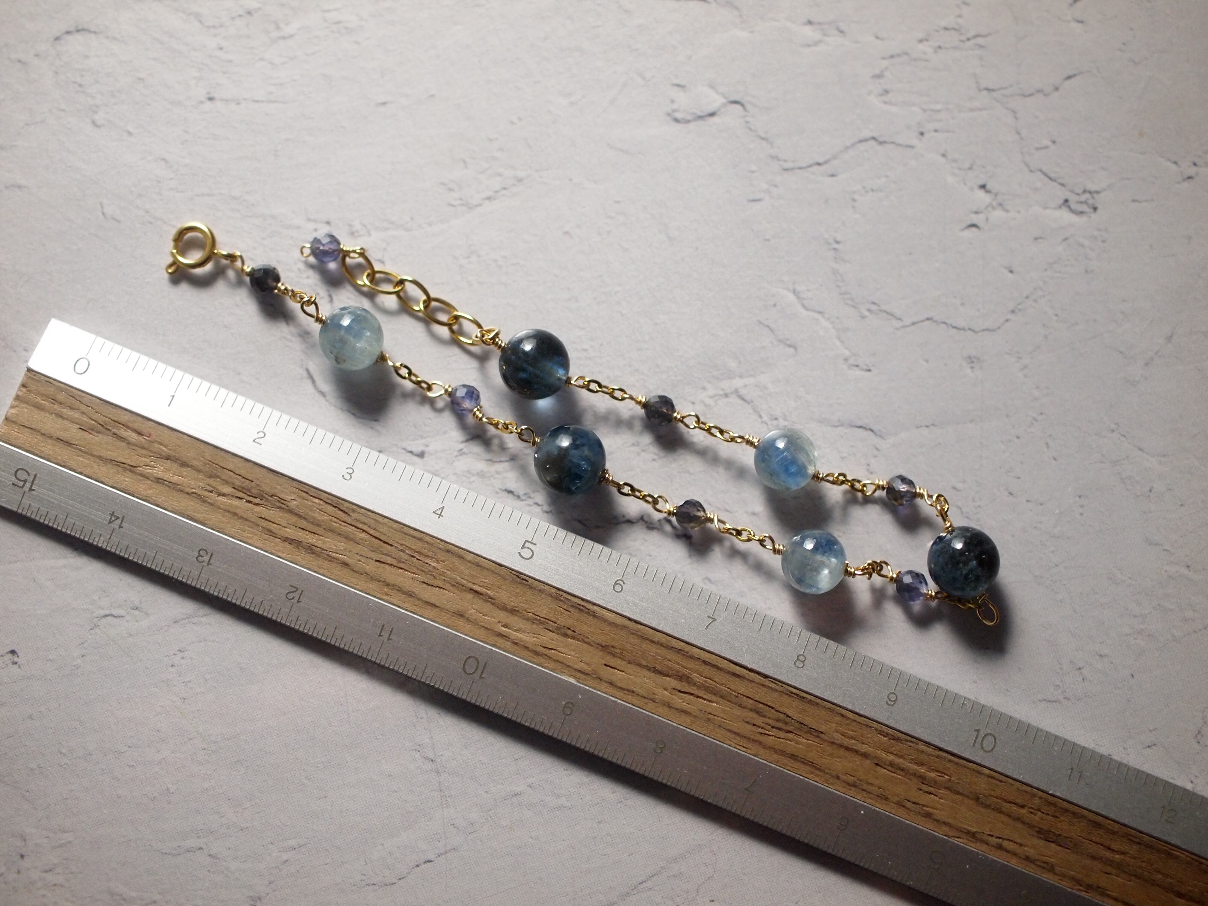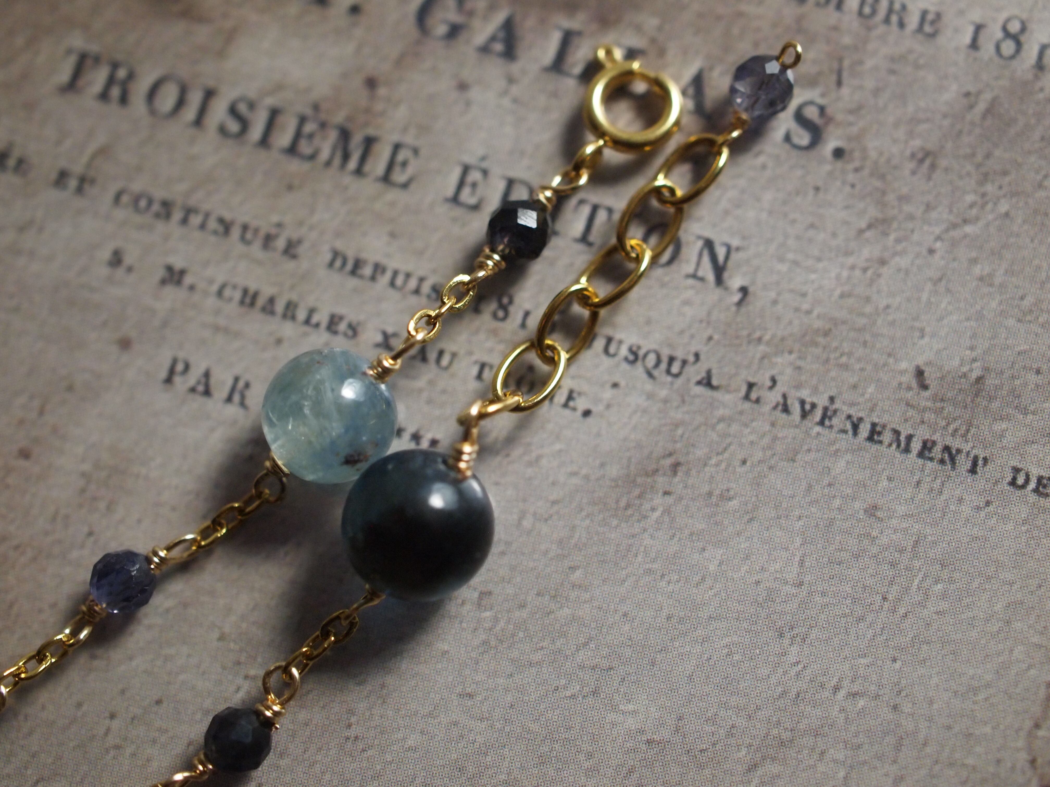 淡い青のカイヤナイトと、小粒のアイオライトを繋いだ
