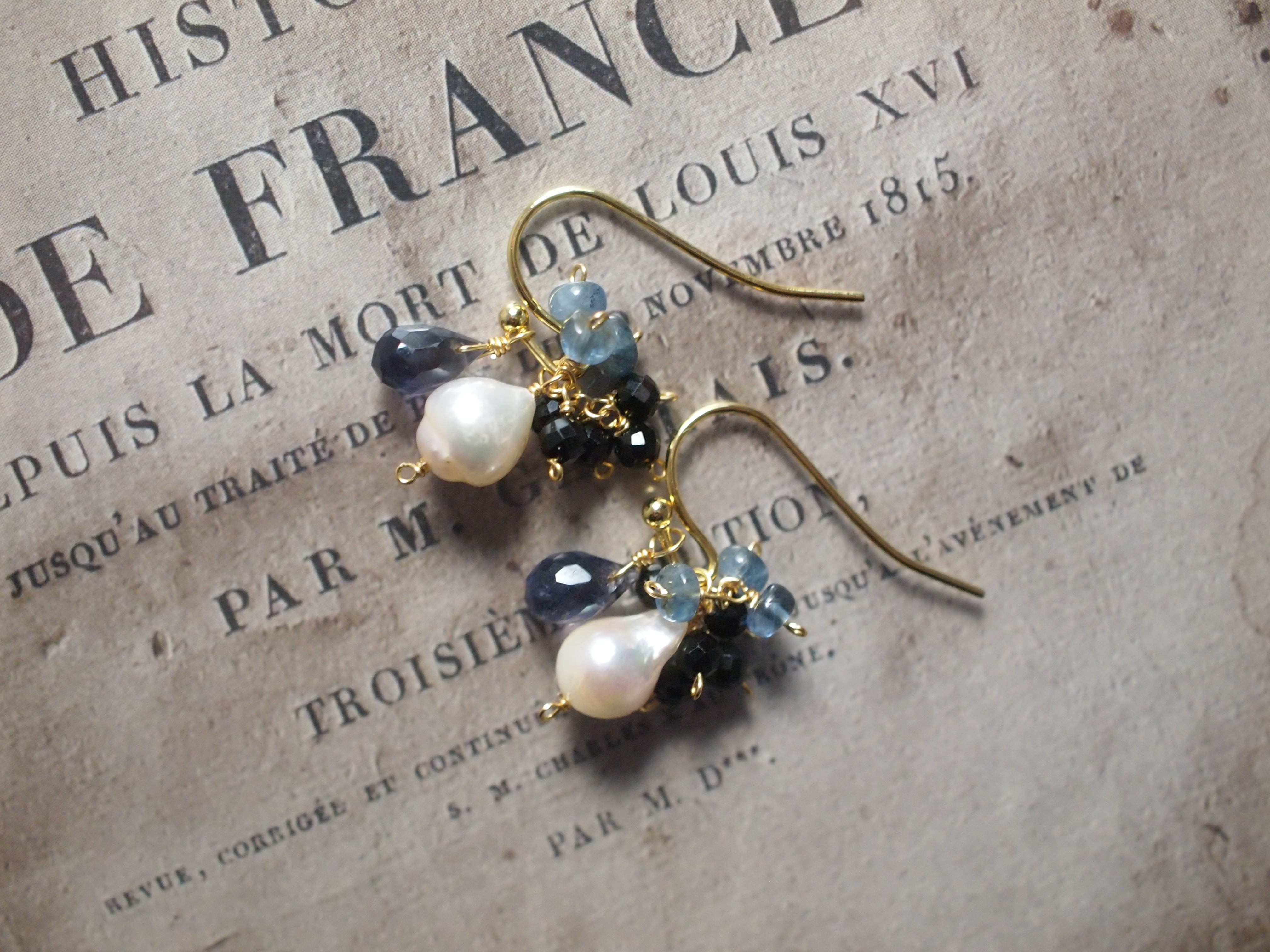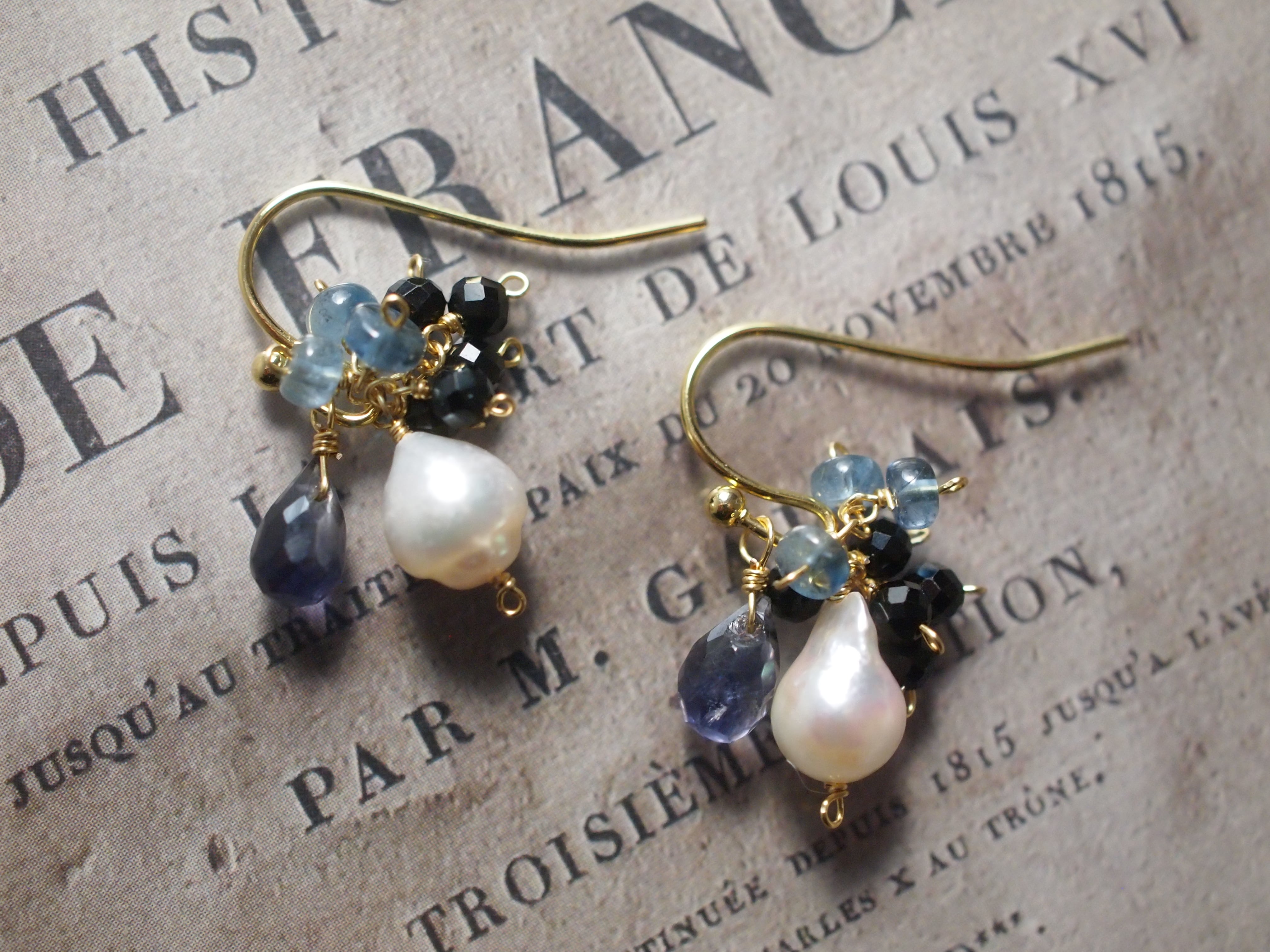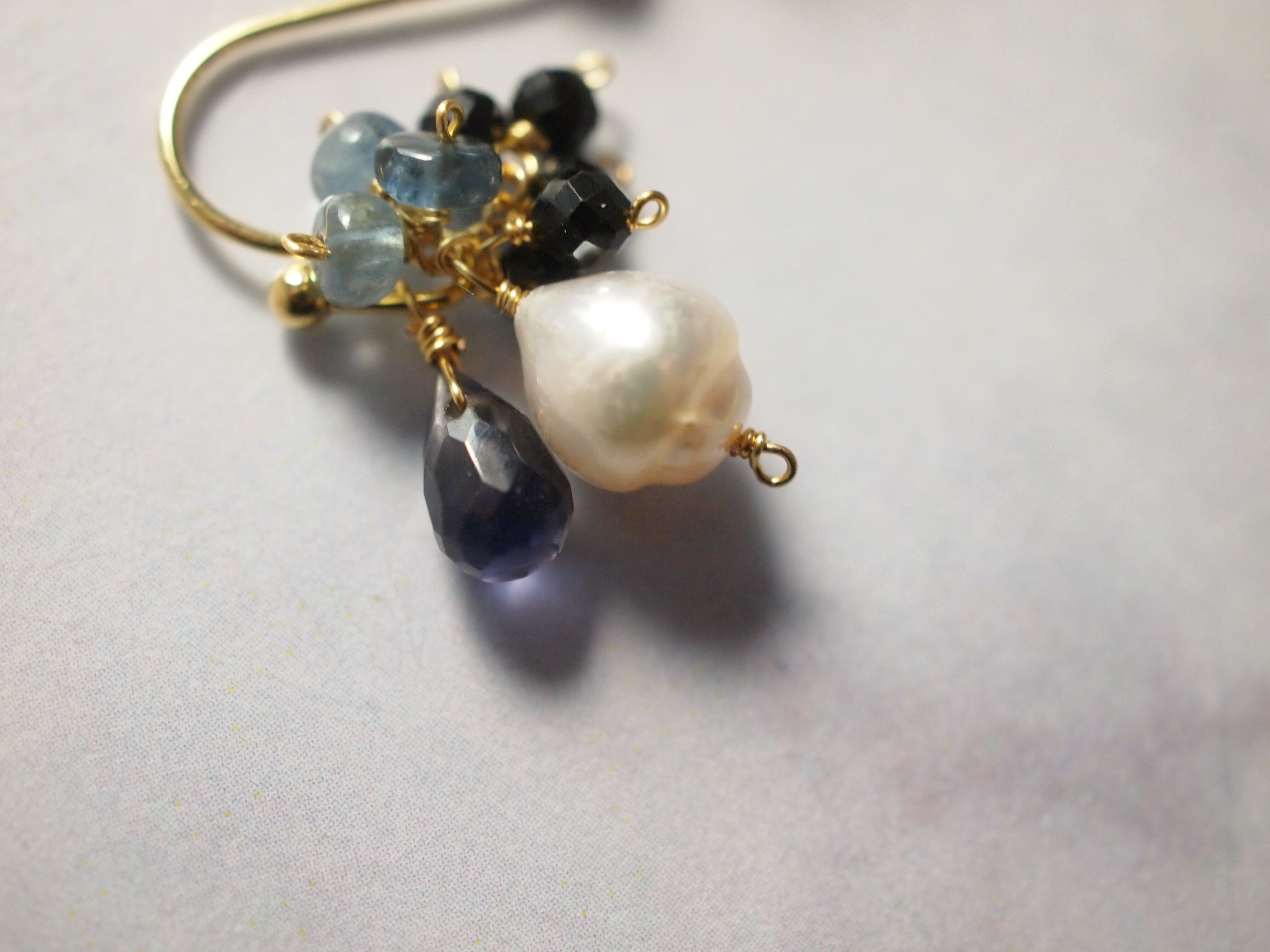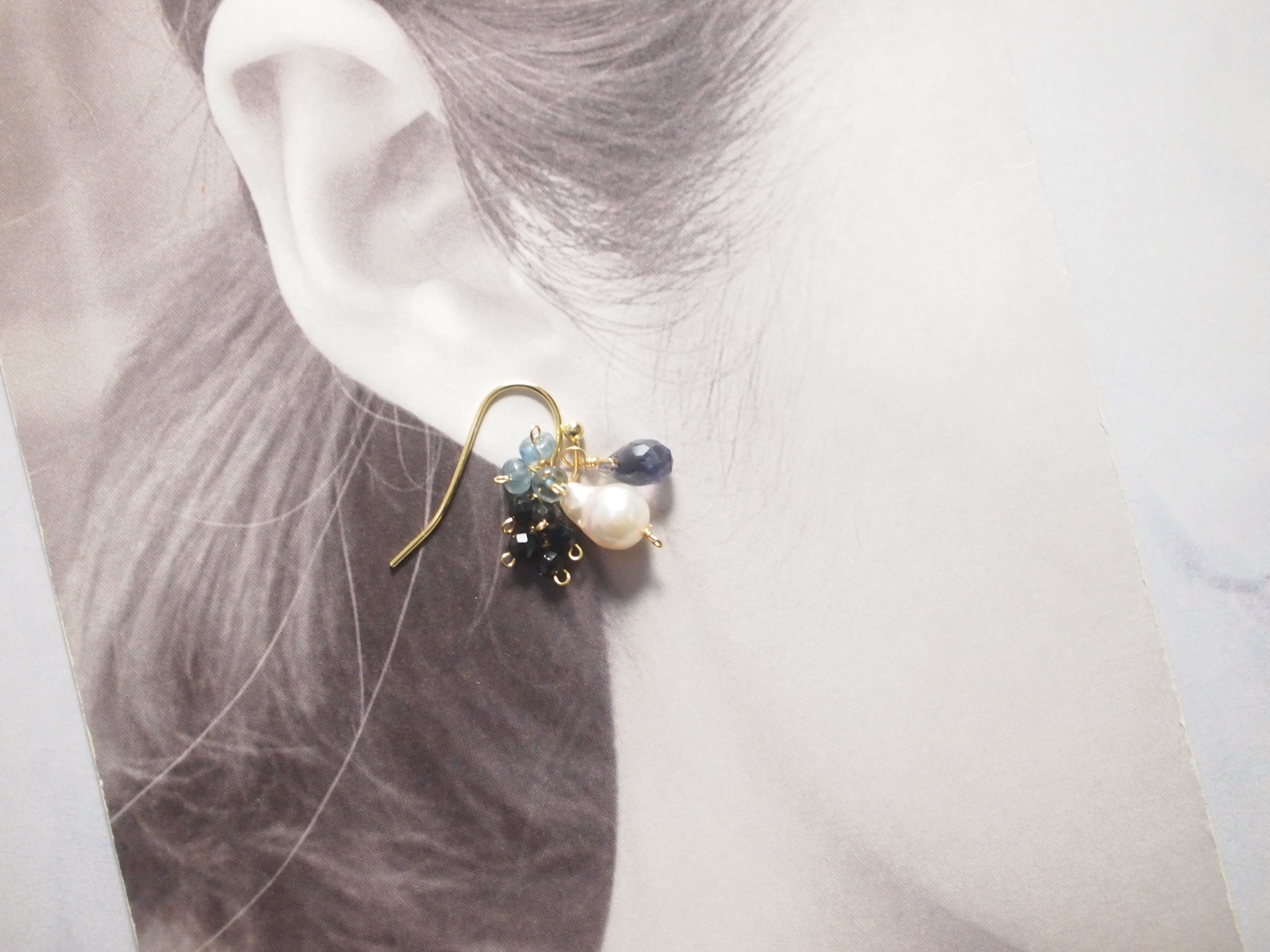 耳元で揺れるたびに、深い青のアイオライトやアクアマリンが光を受けてきらめき、静かで落ち着いた彩りを添えます。