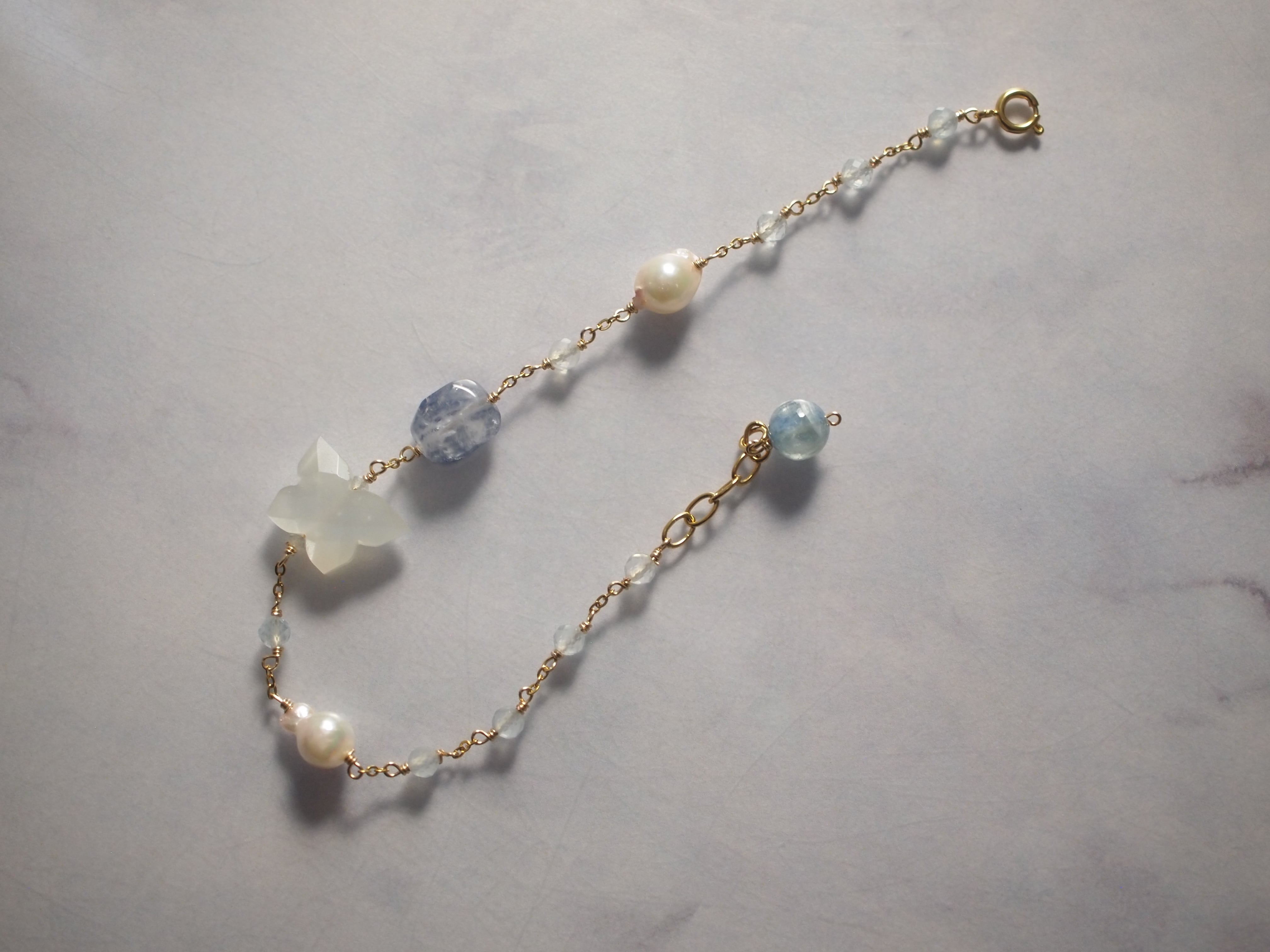 あこや真珠、小粒のアクアマリンを繊細に繋いだブレスレットです。