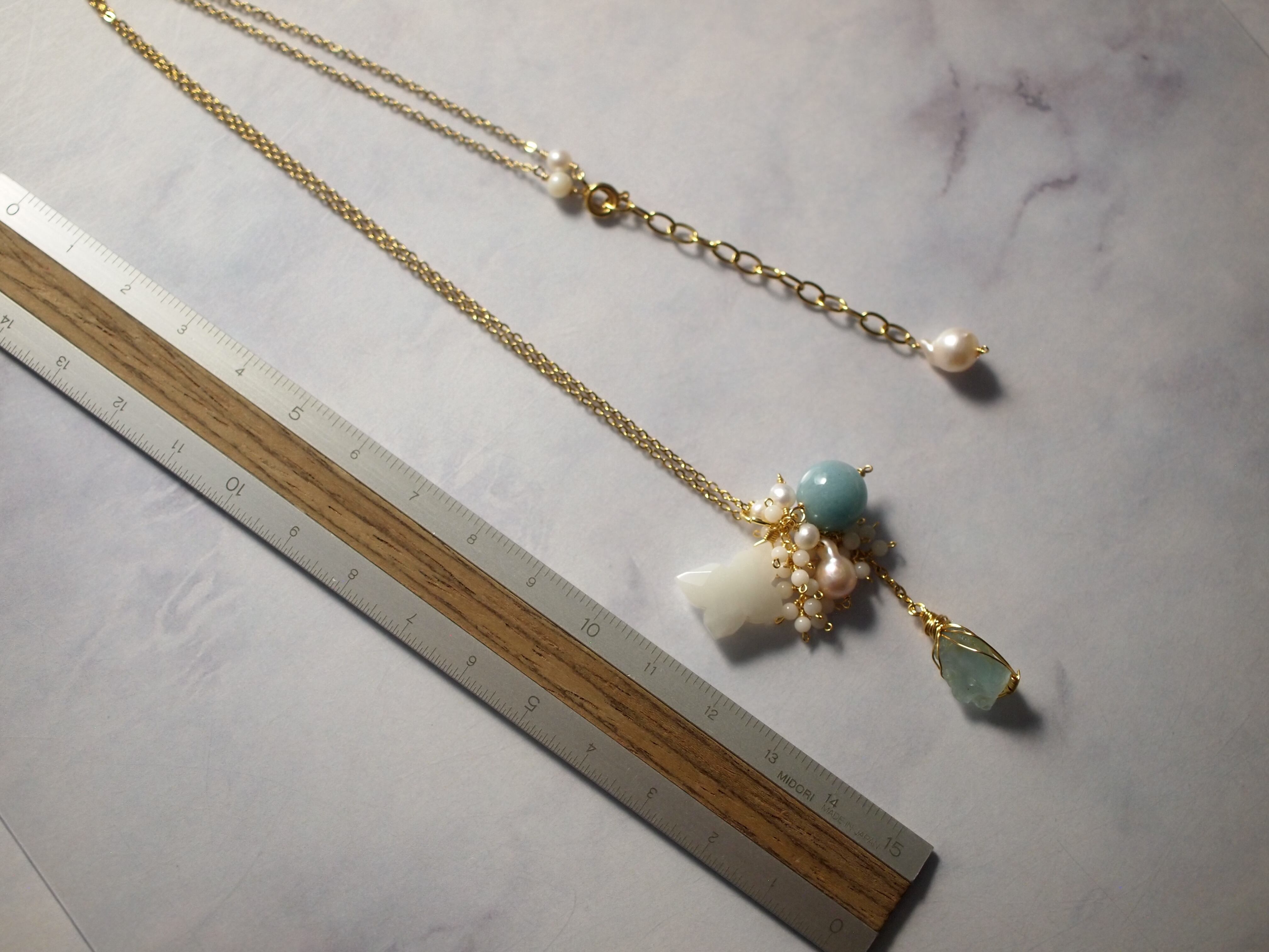 ホワイトムーンストーンの蝶カット、トロレアイト、あこや真珠、サンゴ、淡水パールをたっぷりあしらったネックレスです。