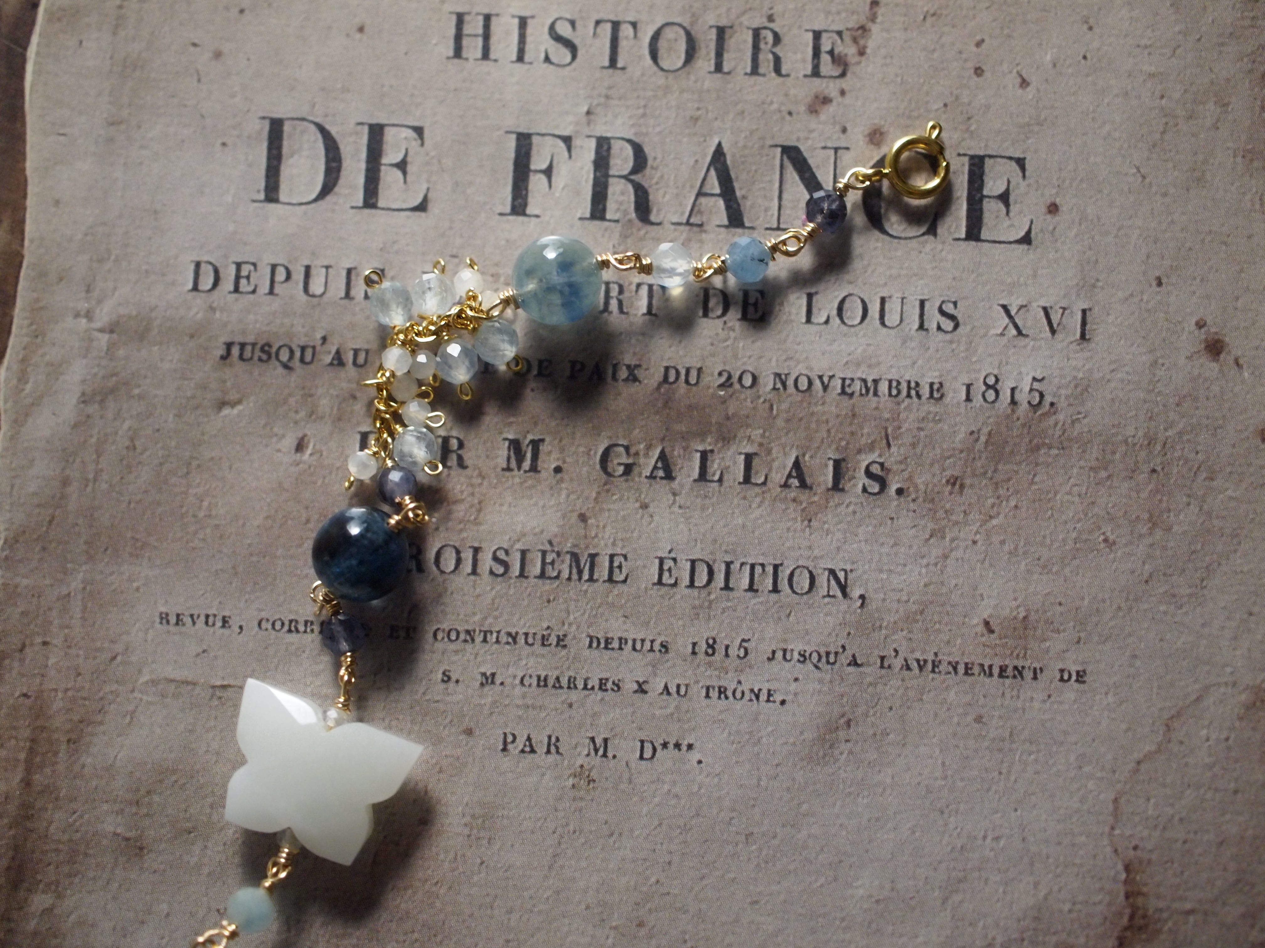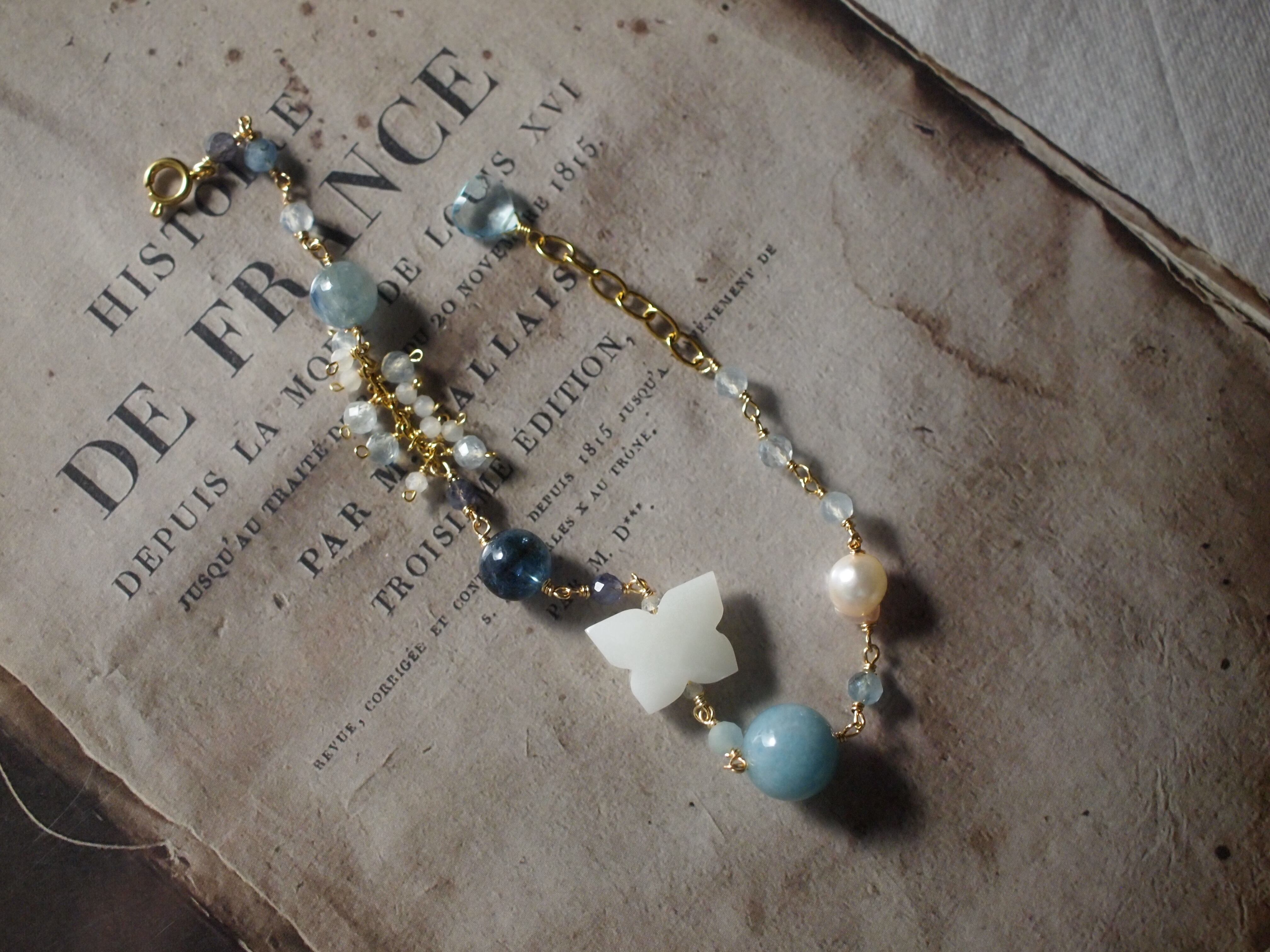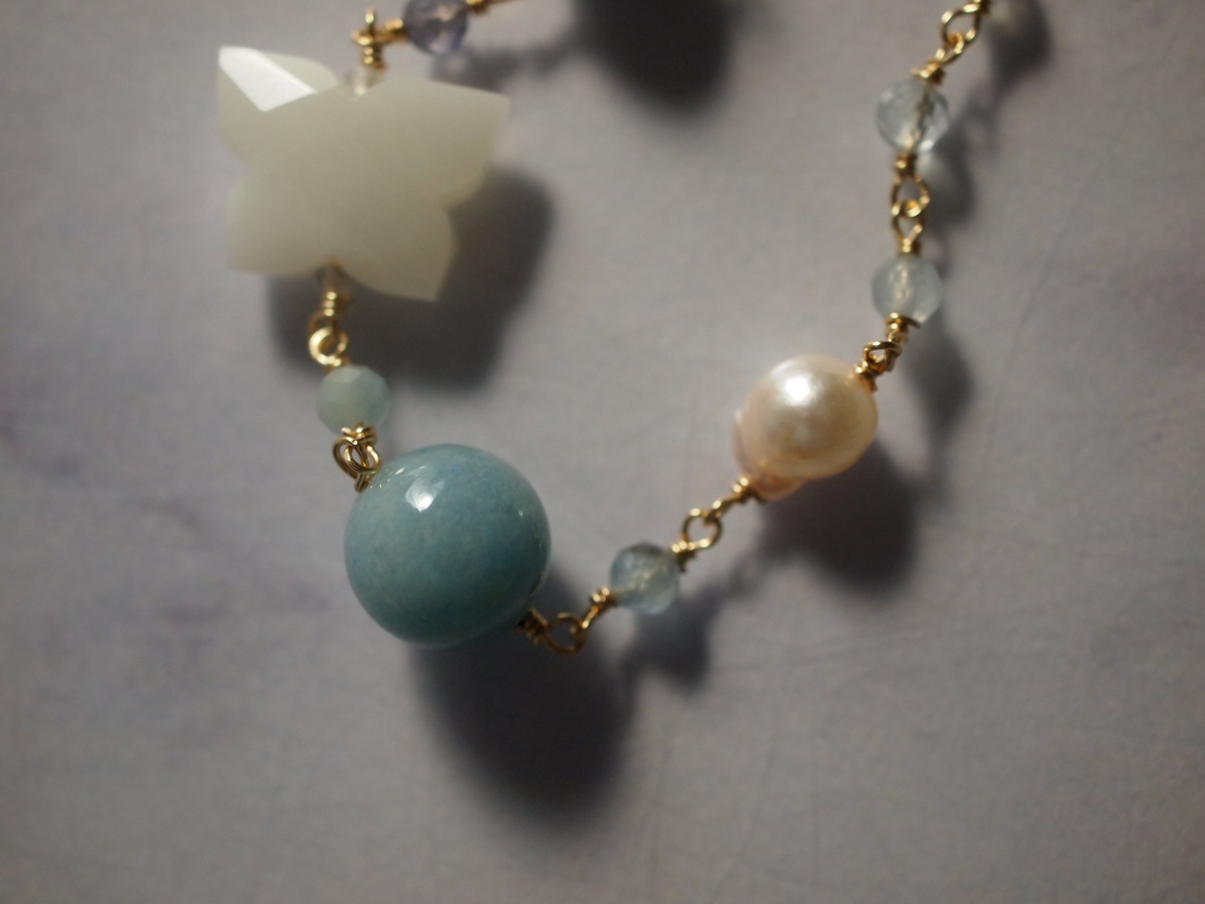 とろんとしたミルキーブルーのトロレアイト、あこや真珠、アクアマリンを繊細に組み合わせたブレスレットです。